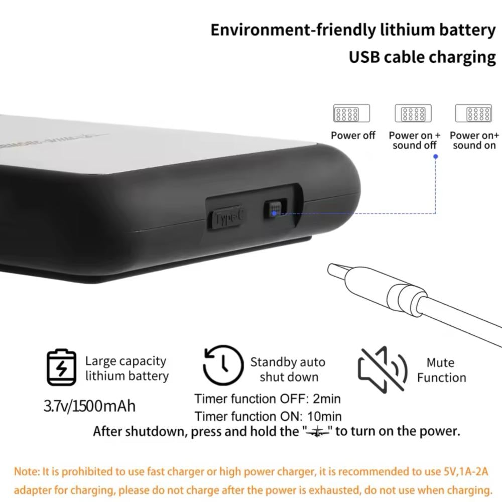 - يحتوي على بطارية ليثيوم قابلة للشحن بسعة 1200 مللي أمبير، مع منفذ شحن TYPE-C.